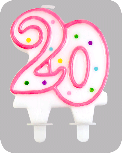 6 kaarsen nummer 20 op een houder.
