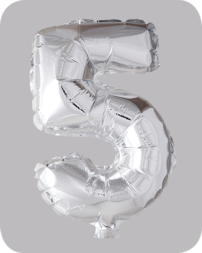 16 inch folieballonnen. Aantal: 9. Nummer: 5 Kleur: zilver