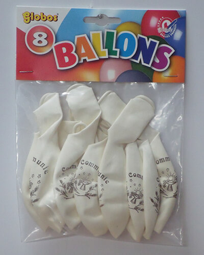 zakje met 8 ballons no. 12 wit, éénzijdig bedrukt met Communie